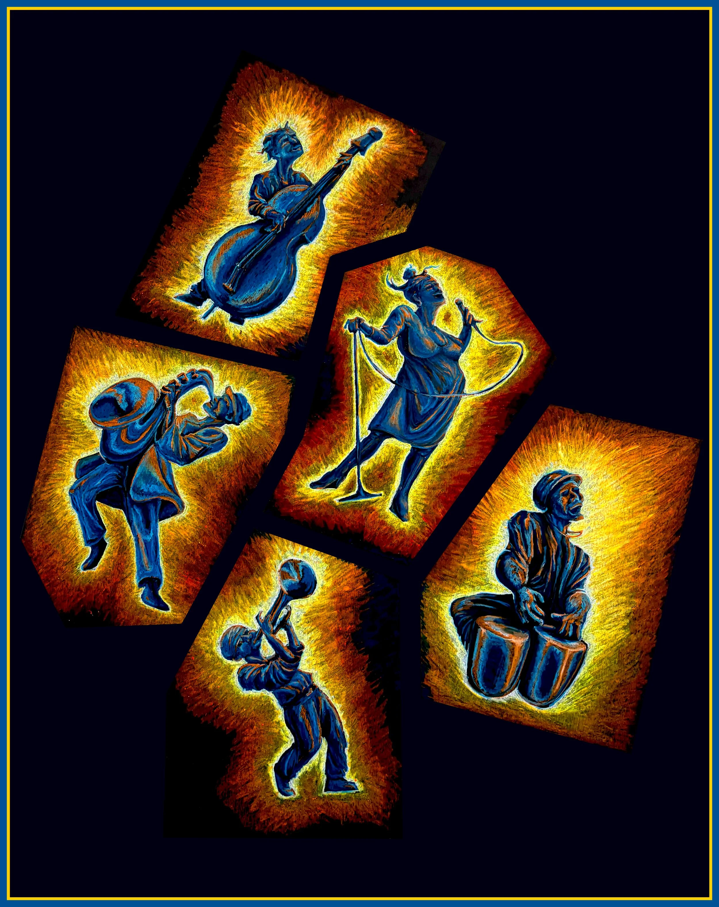 Leather, wood, brass, and flesh- Quality ingredients combined with the spice of the human spirit to create a delicacy for our ears to devour. Like Jazz, color, shape, light, and shadow are curated by the artist as a celebration of our ability to illicit emotions through the use of oil, pigment, and processed wood.